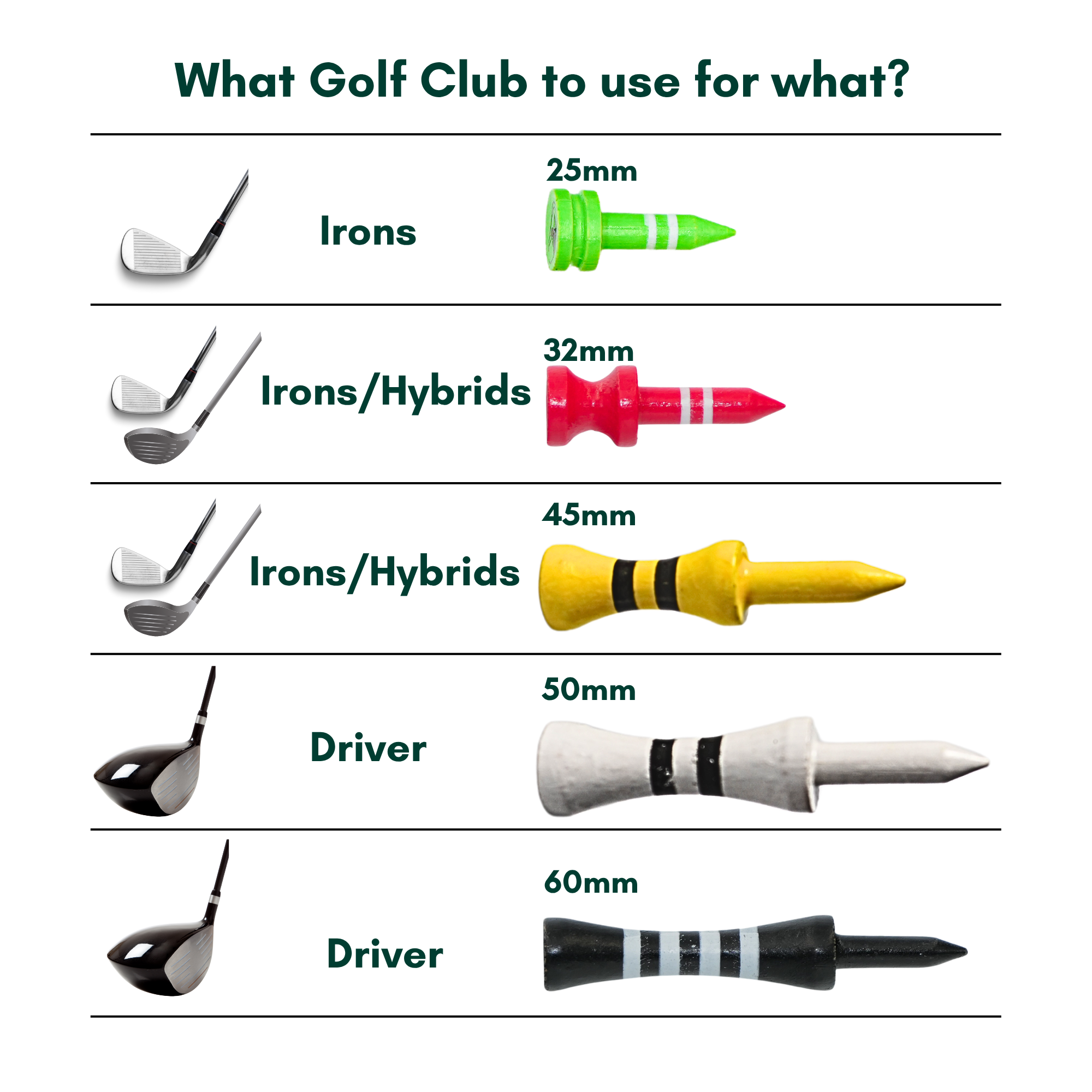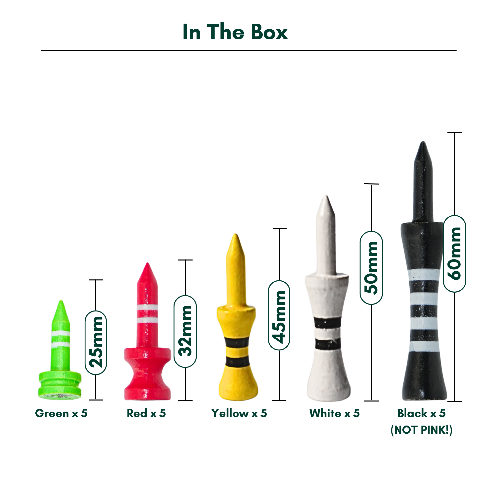 The taller tees like the 50mm white tees and 60mm black tees (replacement for pink!) are perfect for using with your driver, allowing for better ball placement for powerful shots that will give you the right apex and flow through. Meanwhile, shorter tees like the 25mm green tees work better for iron shots, ensuring the ball is placed at the right height for better call control and spin.